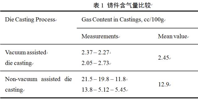 表1為瑞士某真空廠家與Ohio State University聯(lián)合實(shí)驗(yàn)的數(shù)據(jù)。使用真空和不使用真空時(shí),平均每100g鑄件中氣體的含量分別為2.45cc和12.9cc。而且使用真空生產(chǎn)時(shí),生產(chǎn)工藝更加穩(wěn)定。